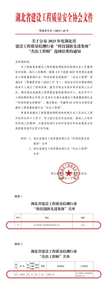 祝賀!市政設計院所屬路源公司及員工榮獲2023年度湖北省建設工程質量檢測行業(yè)“科技創(chuàng)新先進集體”、“杰出工程師” 稱號。