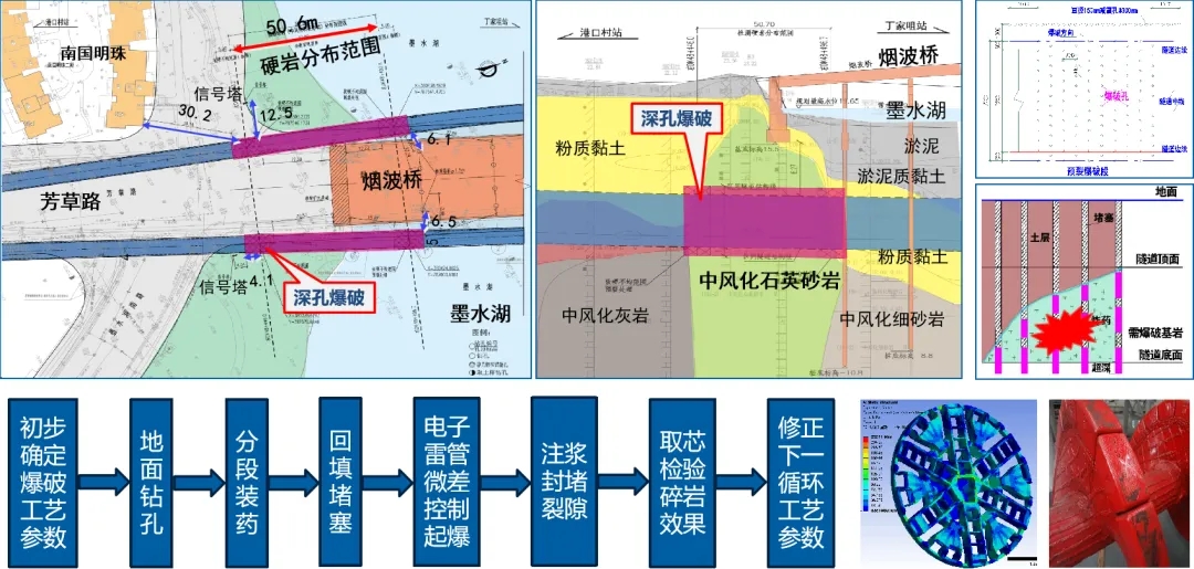 獲獎(jiǎng)項(xiàng)目《地鐵隧道穿越極硬巖的新方法研究》是依托于武漢地鐵12號(hào)線港口村站至丁家咀站區(qū)間隧道工程。本項(xiàng)目存在隧道水下穿越強(qiáng)度高達(dá)251MPa極硬巖的復(fù)雜地質(zhì)和周邊有橋梁、建筑等敏感環(huán)境兩大難題,實(shí)驗(yàn)團(tuán)隊(duì)歷經(jīng)近兩年的方案研究和工程實(shí)踐,創(chuàng)新性地提出了解決方案:采用控制爆破技術(shù)對(duì)極硬巖進(jìn)行預(yù)處理,有效降低盾構(gòu)機(jī)掘進(jìn)的難度,同時(shí)在爆破過(guò)程中采取相應(yīng)的減隔震技術(shù),保障周邊橋梁、房屋和市政管線等建構(gòu)筑物的安全。這一新技術(shù)極大地降低盾構(gòu)機(jī)掘進(jìn)通過(guò)極硬巖的難度,提高了施工效率,大幅減少了工程成本,實(shí)現(xiàn)了良好的社會(huì)和經(jīng)濟(jì)效益。