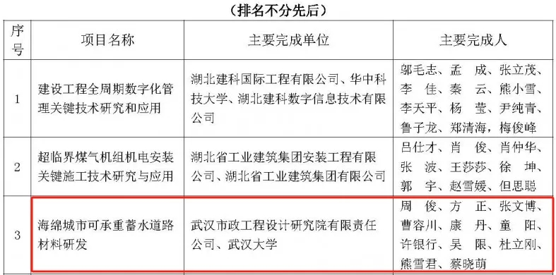 近日,湖北省土木建筑學(xué)會(huì)公布第五屆湖北省土木建筑科學(xué)技術(shù)獎(jiǎng)獲獎(jiǎng)名單,由武漢市政院牽頭、武漢大學(xué)共同參與的《海綿城市可承重蓄水道路材料研發(fā)》科研項(xiàng)目榮獲二等獎(jiǎng)。