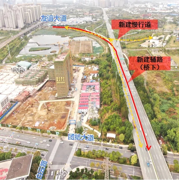 為解決周邊慢行系統(tǒng)連接缺失問題,本項(xiàng)目新建慢行道連接友誼大道立交東西兩側(cè)及友誼大道至團(tuán)結(jié)大道,并與楊春湖公園綠道連接成環(huán),在立交范圍內(nèi)構(gòu)建一個(gè)更加安全、便捷、舒適的慢行交通系統(tǒng)。