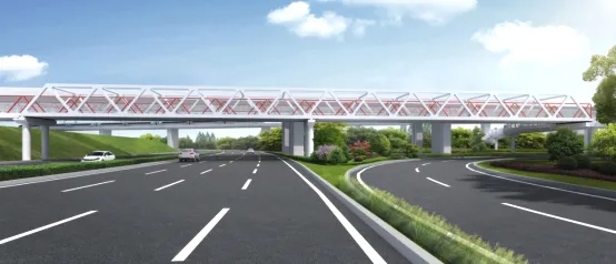 ? ? 跨三環(huán)線慢行橋采用桁架梁結(jié)構(gòu),桁架以“江城鐵運”為設(shè)計概念,以飛馳而過的火車為設(shè)計意向,形成動感而具有生命力的橋梁造型。在桁架之間固定的防拋網(wǎng)中采用連綿起伏的山形鋼條作為裝飾,如火車飛馳經(jīng)過群山,使天橋整體富有故事感。