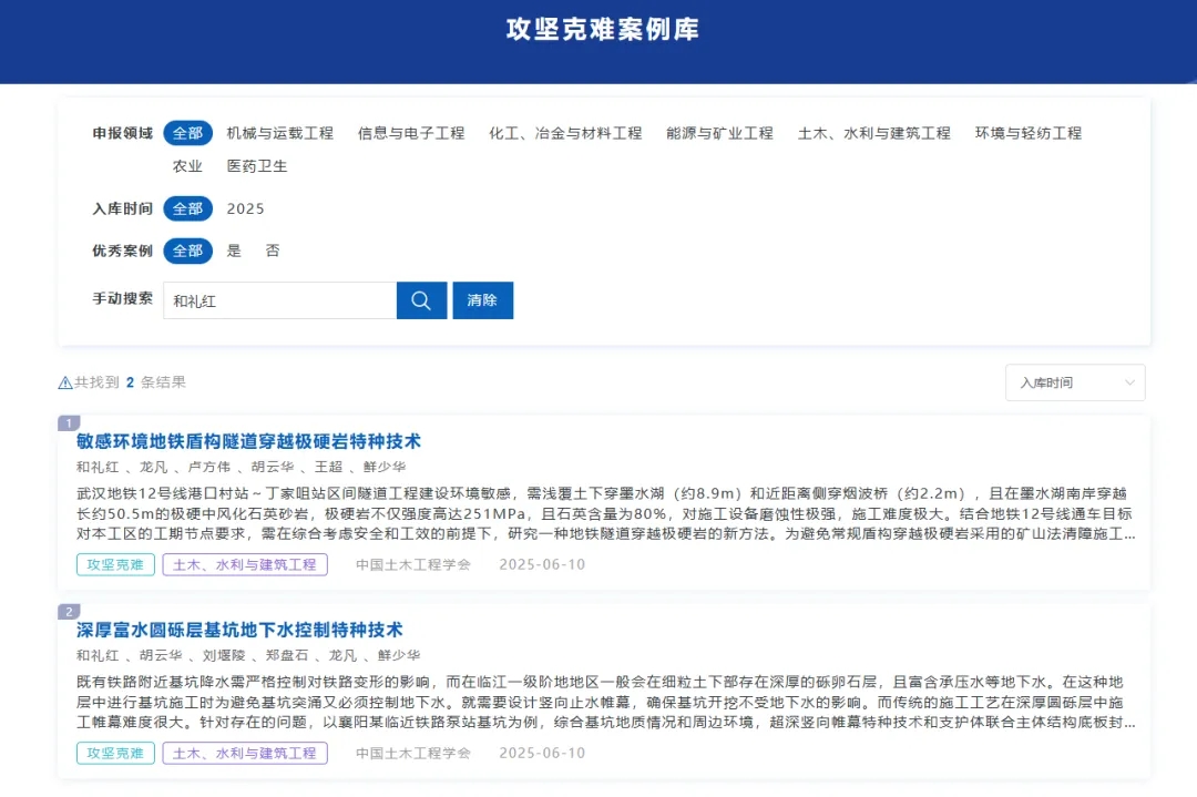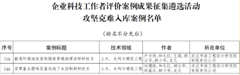 ? ? ?2025年6月4日,中國科協(xié)發(fā)布了《關(guān)于企業(yè)科技工作者評價(jià)案例成果征集遴選活動結(jié)果的通知》,公布了《企業(yè)科技工作者評價(jià)案例庫》,其中攻堅(jiān)克難案例843項(xiàng)、成果轉(zhuǎn)化案例726項(xiàng)。武漢市政院巖土博士創(chuàng)新工作室申報(bào)的“敏感環(huán)境地鐵盾構(gòu)隧道穿越極硬巖特種技術(shù)”、“深厚富水圓礫層基坑地下水控制特種技術(shù)”兩項(xiàng)攻堅(jiān)克難案例與技術(shù)均成功入庫。