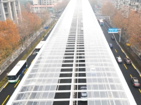 ? ? 項(xiàng)目設(shè)計(jì)團(tuán)隊(duì)始終秉持 “輕量化、智能化、綠色化” 理念,多項(xiàng)技術(shù)應(yīng)用填補(bǔ)區(qū)域空白,樹立行業(yè)新標(biāo)桿。在鋪裝材料與工藝上,主線高架鋼箱梁橋面采用澆注式瀝青鋪裝,相比傳統(tǒng)方案減重16%,既降低橋梁結(jié)構(gòu)負(fù)荷、提升安全性,又縮短施工周期;鋼箱梁采用U肋全熔透智能焊接,大幅提高結(jié)構(gòu)疲勞壽命,積極推進(jìn)鋼箱梁U肋焊接工藝的發(fā)展。尤為引人注目的是,本項(xiàng)目集中展現(xiàn)了三大創(chuàng)新亮點(diǎn):它擁有全國最長的連續(xù)全封閉聲屏障,是湖北省首例“光伏+市政”的融合實(shí)踐,更在武漢率先實(shí)現(xiàn)了聲屏障光伏發(fā)電的應(yīng)用,為綠色市政建設(shè)樹立了新的樣板。