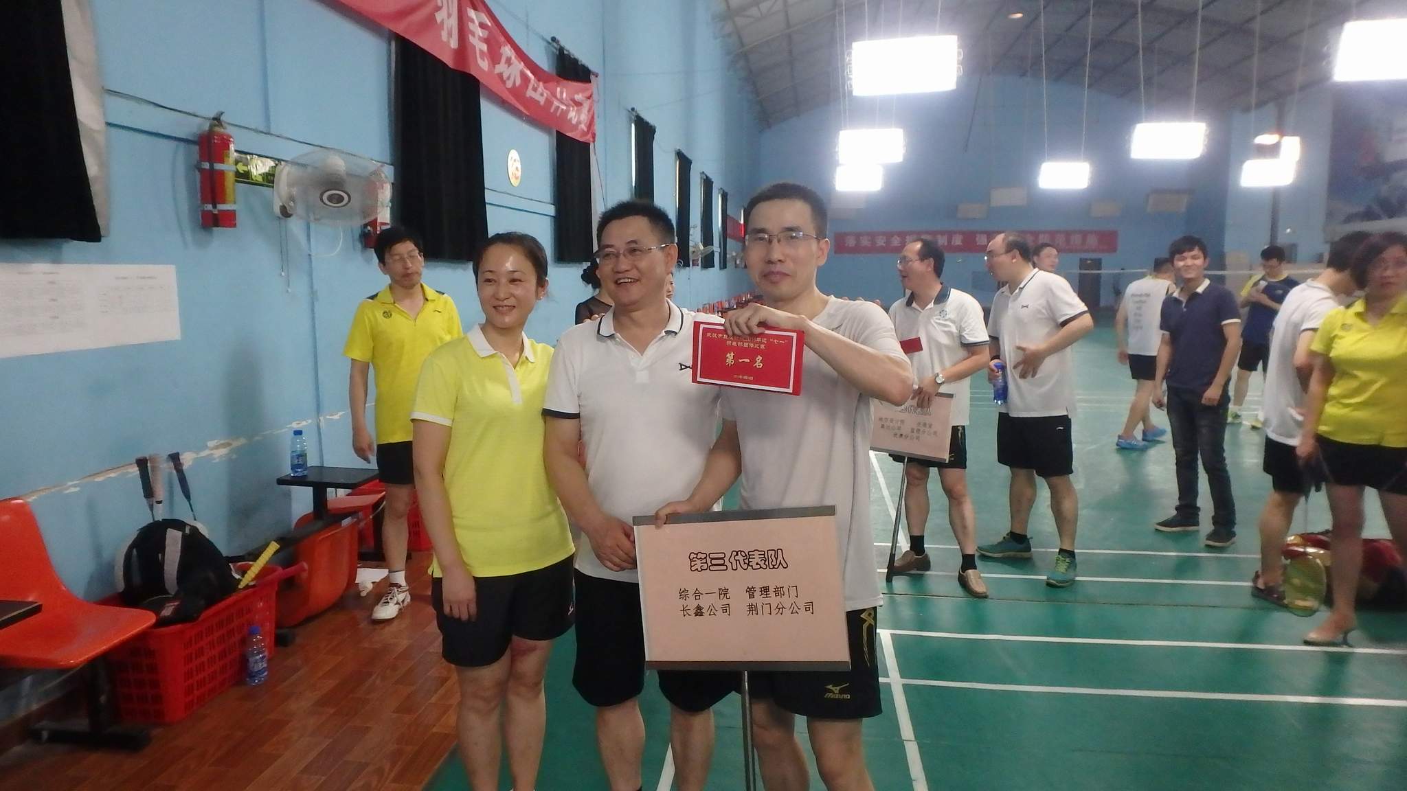 ??? 經(jīng)過(guò)三個(gè)小時(shí)激烈角逐,比賽全部結(jié)束。而富有戲劇性的是,有三支隊(duì)伍各勝了兩場(chǎng),積分相同。在這種情況下,裁判組通過(guò)統(tǒng)計(jì)每隊(duì)勝場(chǎng)及勝負(fù)關(guān)系,由黨委書(shū)記蔡輝領(lǐng)銜、由綜合一院、管理部門(mén)、長(zhǎng)鑫公司、荊門(mén)分公司聯(lián)合組成的第三代表隊(duì)獲得了最終的冠軍。