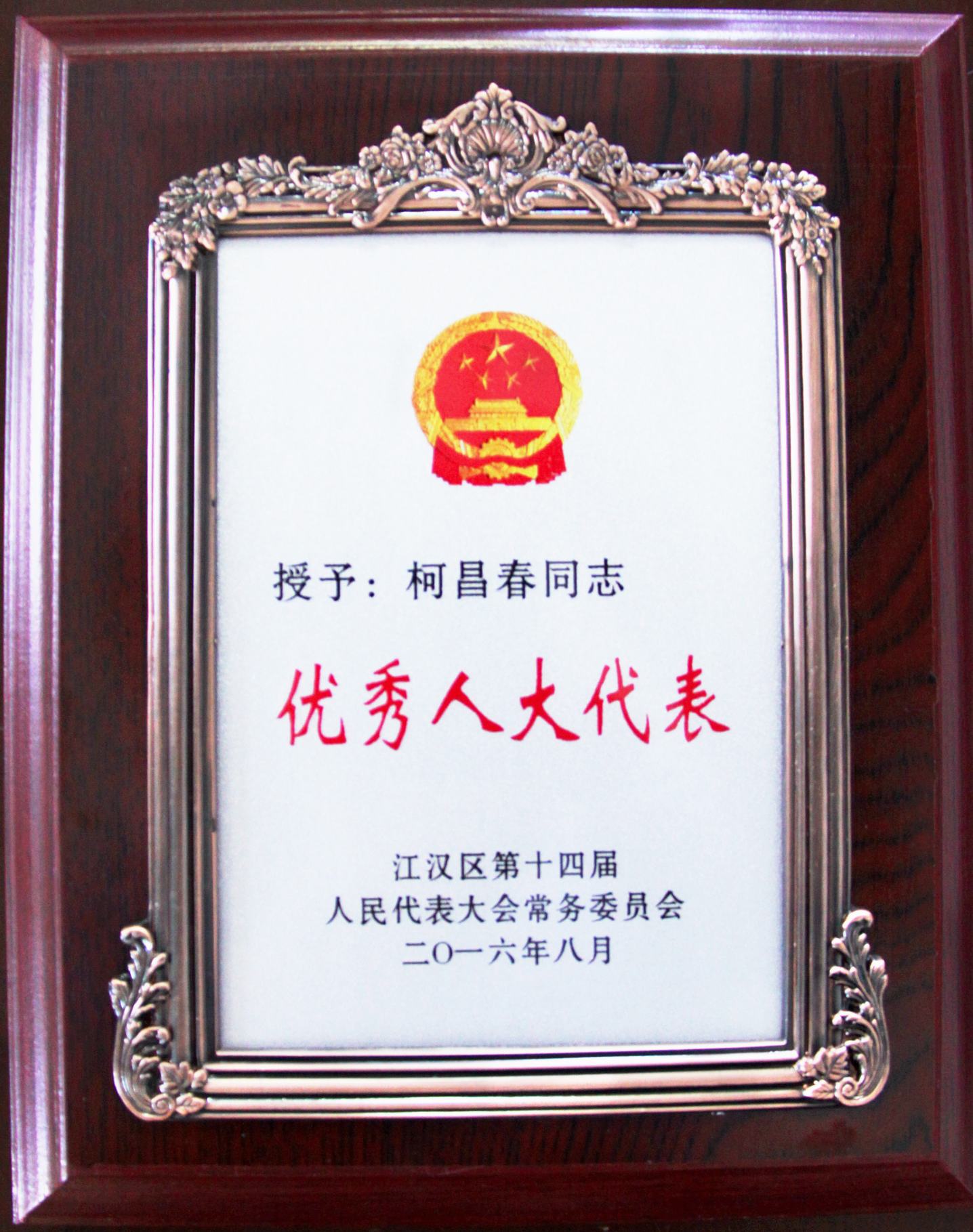??? 近日,一則喜報從江漢區(qū)人大傳來,公司董事長柯昌春同志在擔(dān)任江漢區(qū)人大代表期間積極為江漢區(qū)的建設(shè)和發(fā)展建言獻策,被江漢區(qū)人大授予“優(yōu)秀人大代表”榮譽稱號。