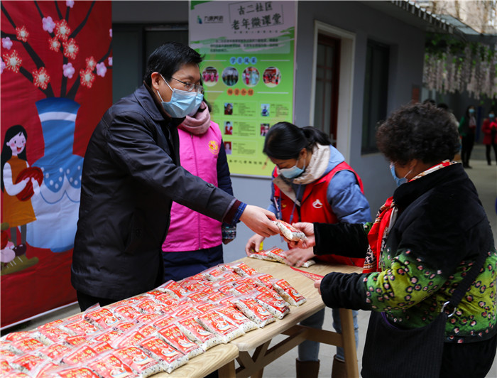 慰問(wèn)期間,恰逢社區(qū)正在開展“臘八送福·甜蜜相伴”活動(dòng),談逢陽(yáng)一行也加入其中,熱情地為前來(lái)的社區(qū)居民發(fā)放臘八米,送上殷切的節(jié)日祝福,叮囑他們要做好防護(hù)。